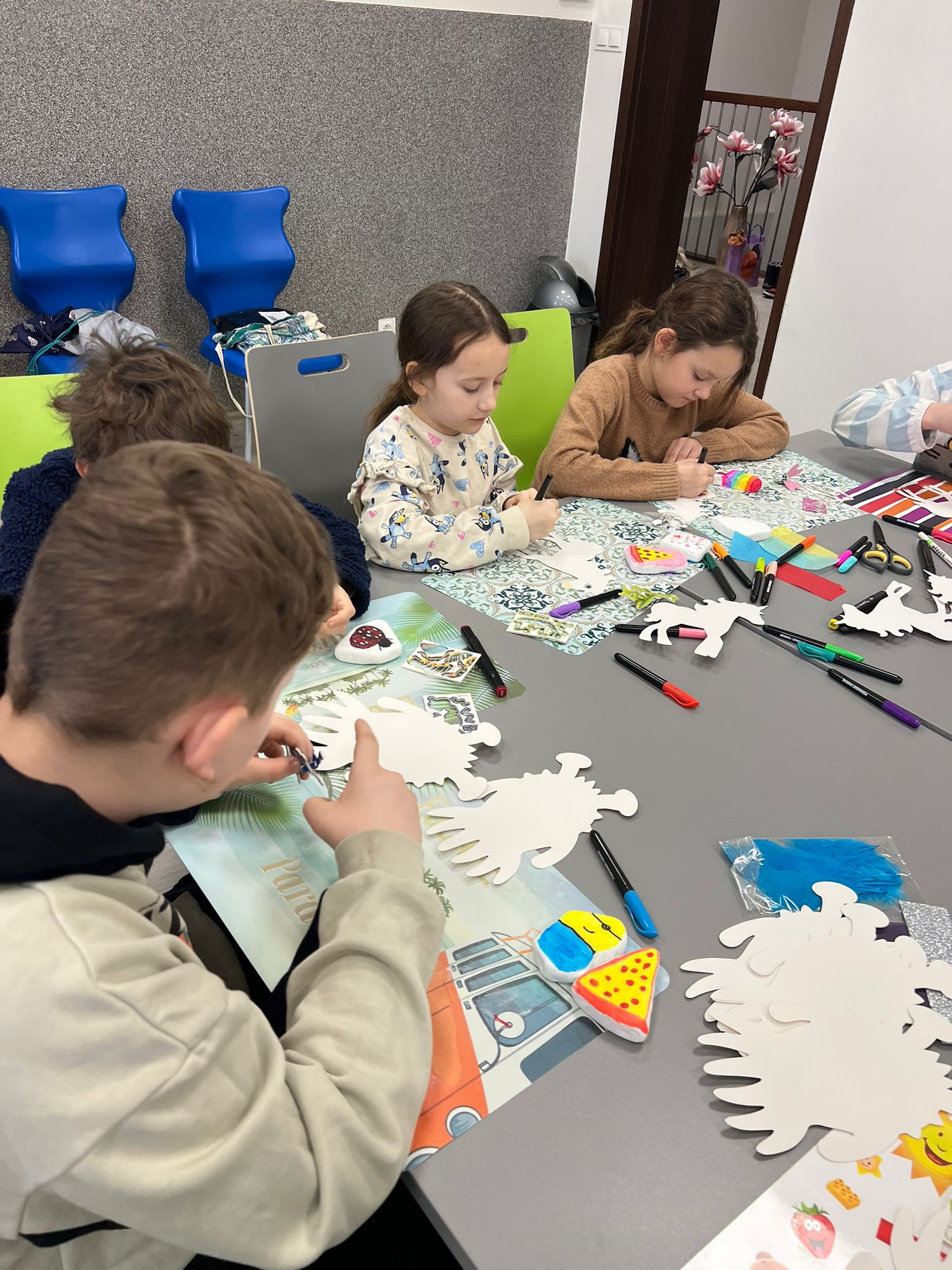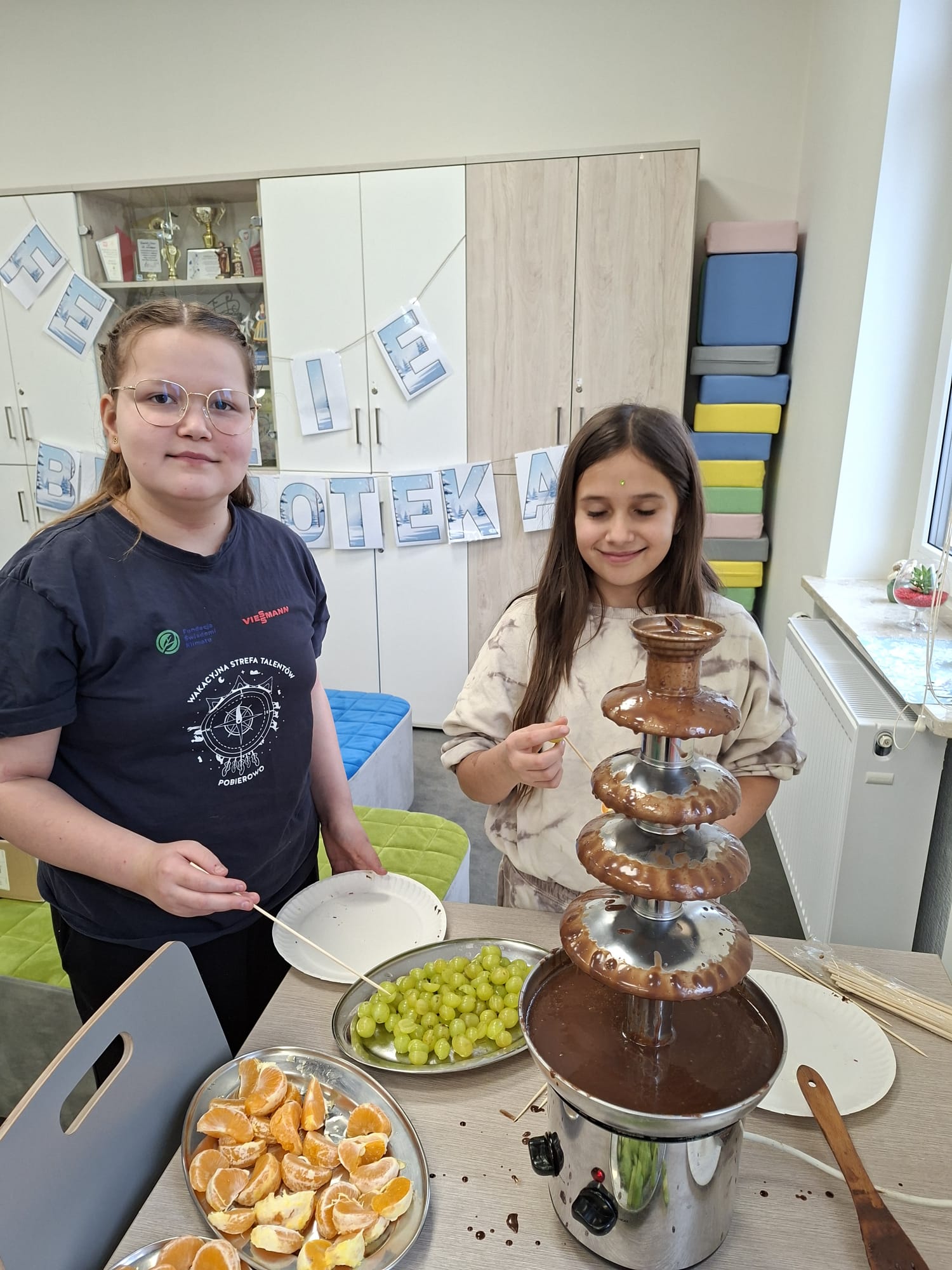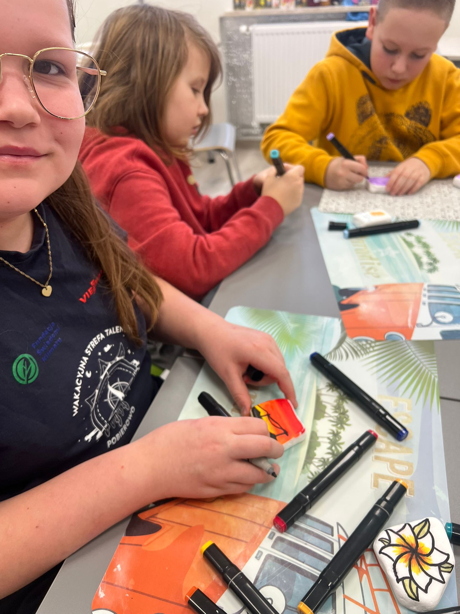 Czas znalazł się również na twórczość artystyczną – dzieci malowały kamyczki w ramach akcji polegającej na zostawianiu ich w różnych miejscach, by sprawić radość przypadkowym znalazcom. Jednym z najbardziej wyczekiwanych momentów był słodki akcent dnia: gofry oraz czekoladowa fontanna, które wywołały uśmiechy od ucha do ucha.