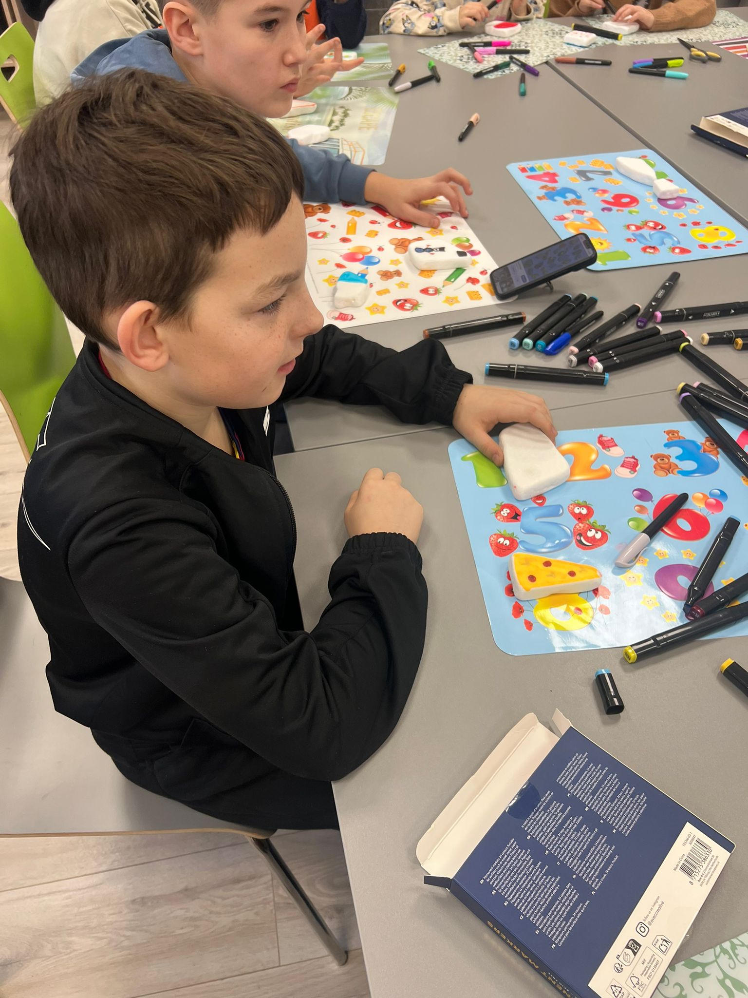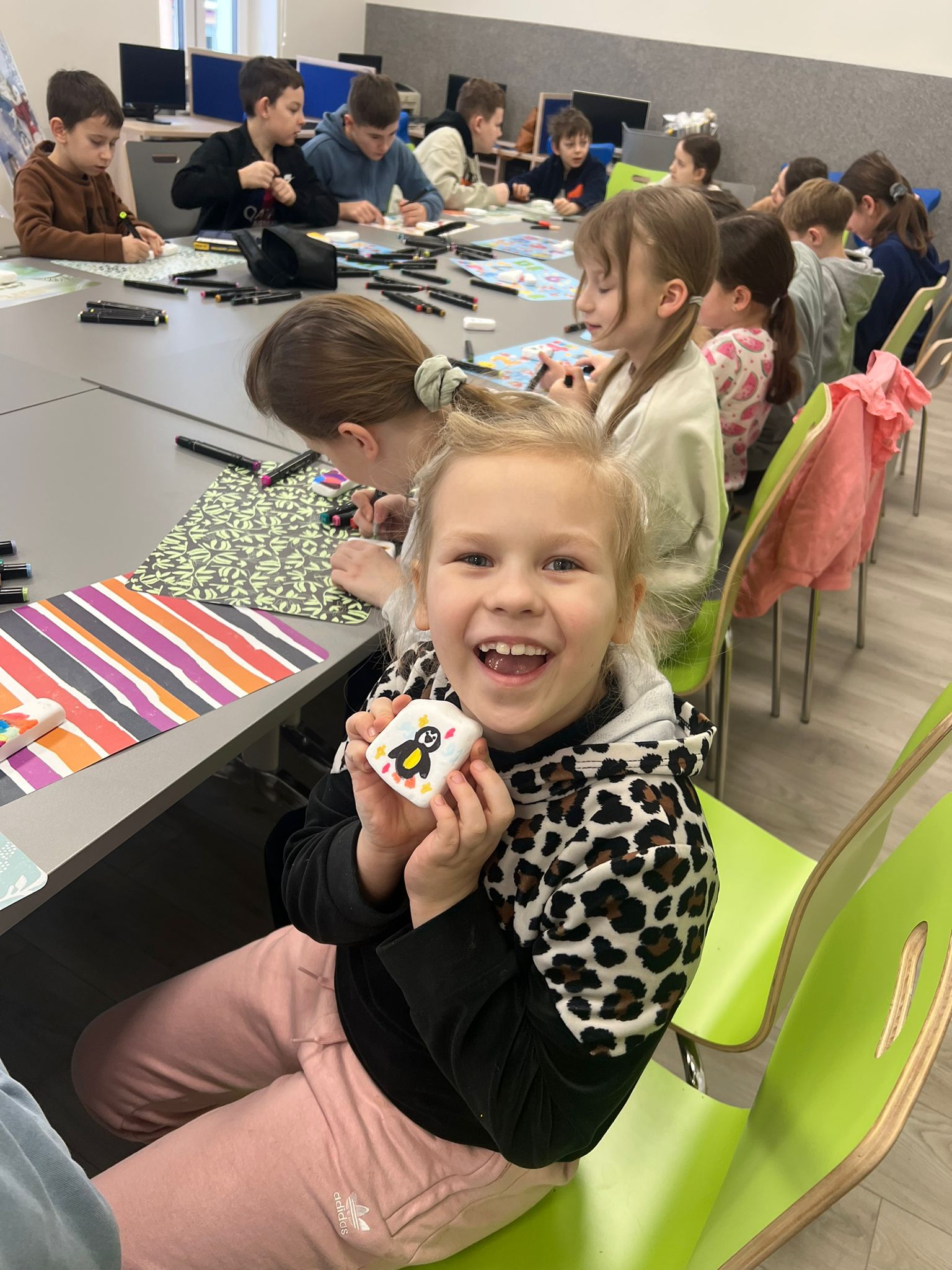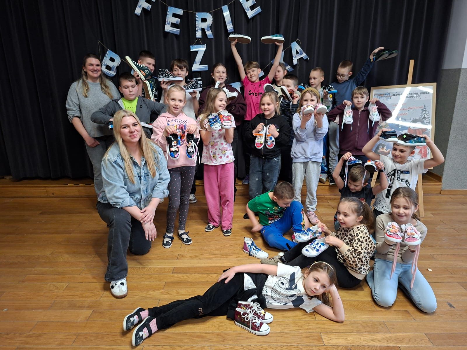 Kolejne spotkania przeniosły uczestników w świat eksperymentów i dziecięcej ciekawości. Dzieci samodzielnie tworzyły piankolinę, domowy piasek kinetyczny, ciecz nienewtonowską oraz uwielbiany slime. Było kolorowo, twórczo i bardzo wesoło. Podczas warsztatów z panią Eweliną Płócienniczak zwykłe trampki zamieniły się w małe dzieła sztuki – powstały unikatowe, barwne projekty, z których każdy uczestnik mógł być dumny.
