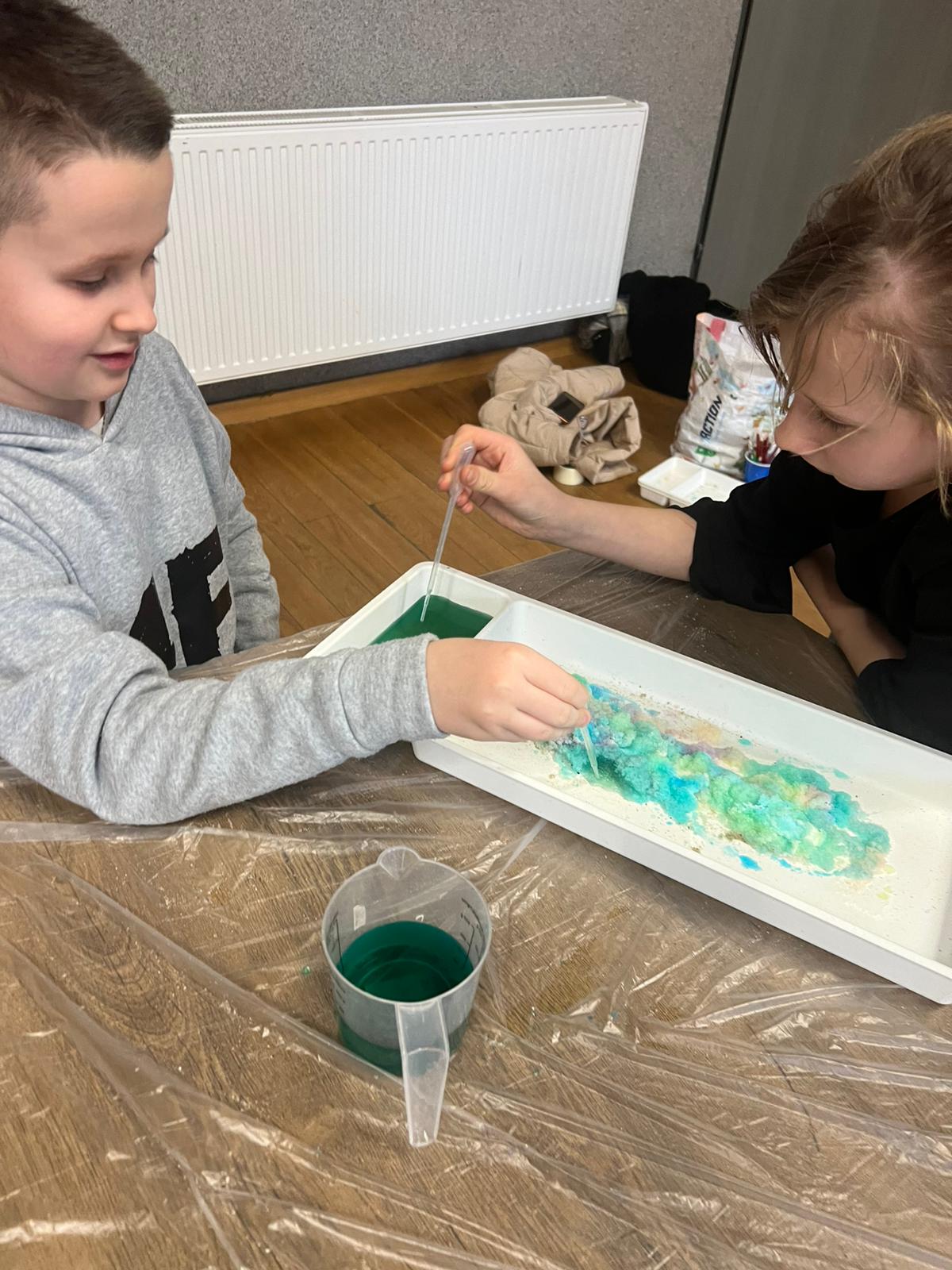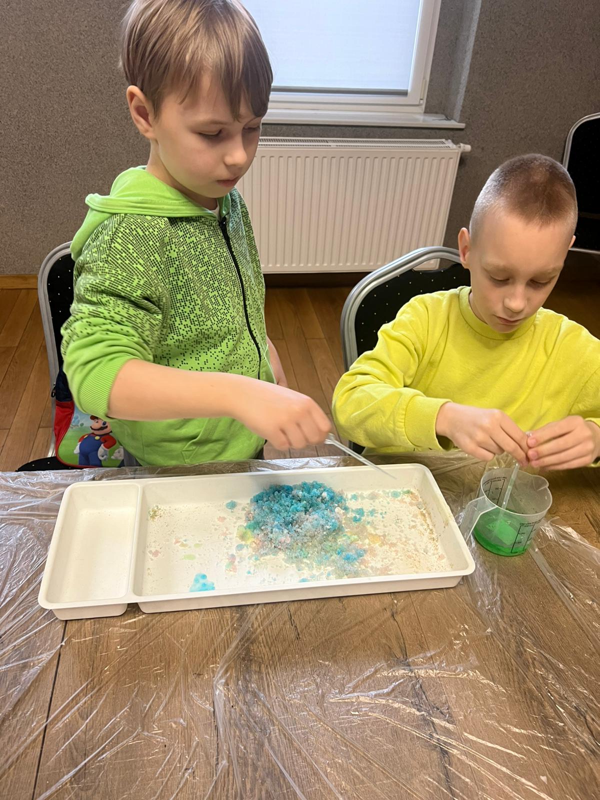 Nie zabrakło także emocjonującej zabawy w archeologów – dzieci prowadziły wykopaliska i odkrywały ukryte „skarby”, co wywoływało wiele radości i ekscytacji. Kolejne zajęcia dostarczyły uczestnikom sensorycznych i naukowych doświadczeń. Były eksperymenty z kolorowym hydrożelem, tworzenie slime, budowanie magnetycznych labiryntów z klocków LEGO i opiłków żelaza oraz poznawanie właściwości magnesów poprzez zabawę. Nauka przez działanie okazała się prawdziwym strzałem w dziesiątkę.
