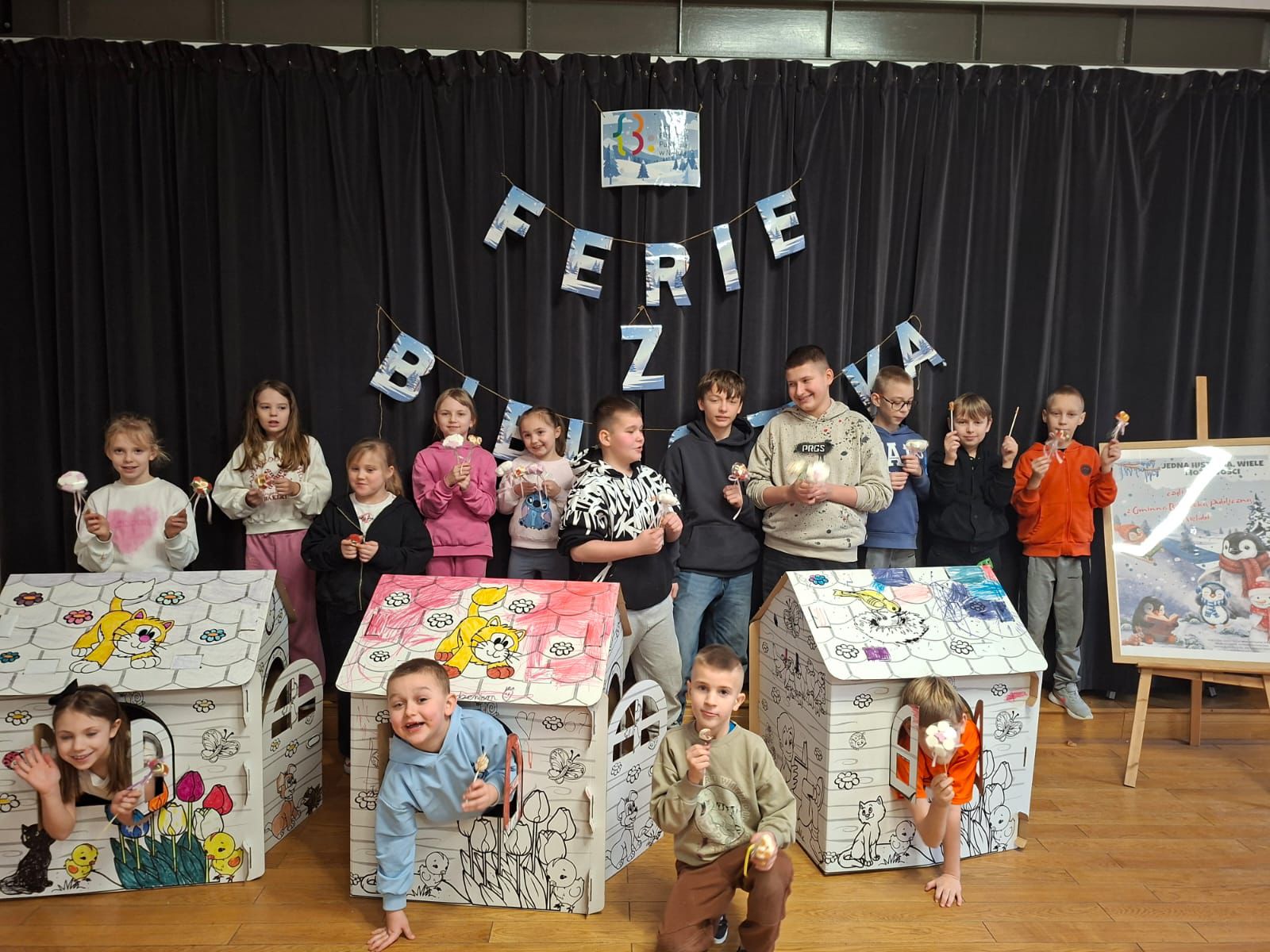 Nie zabrakło również wspólnego budowania – razem powstała mała osada jak z Bullerbyn. Tylko trzy domy, ale za to ile współpracy, śmiechu i integracji podczas tworzenia. Na zakończenie ferii odbył się słodki dzień pełen radości: były gofry, cake popsy oraz kreatywne, kolorowe kwiaty z pianek i żelków.
