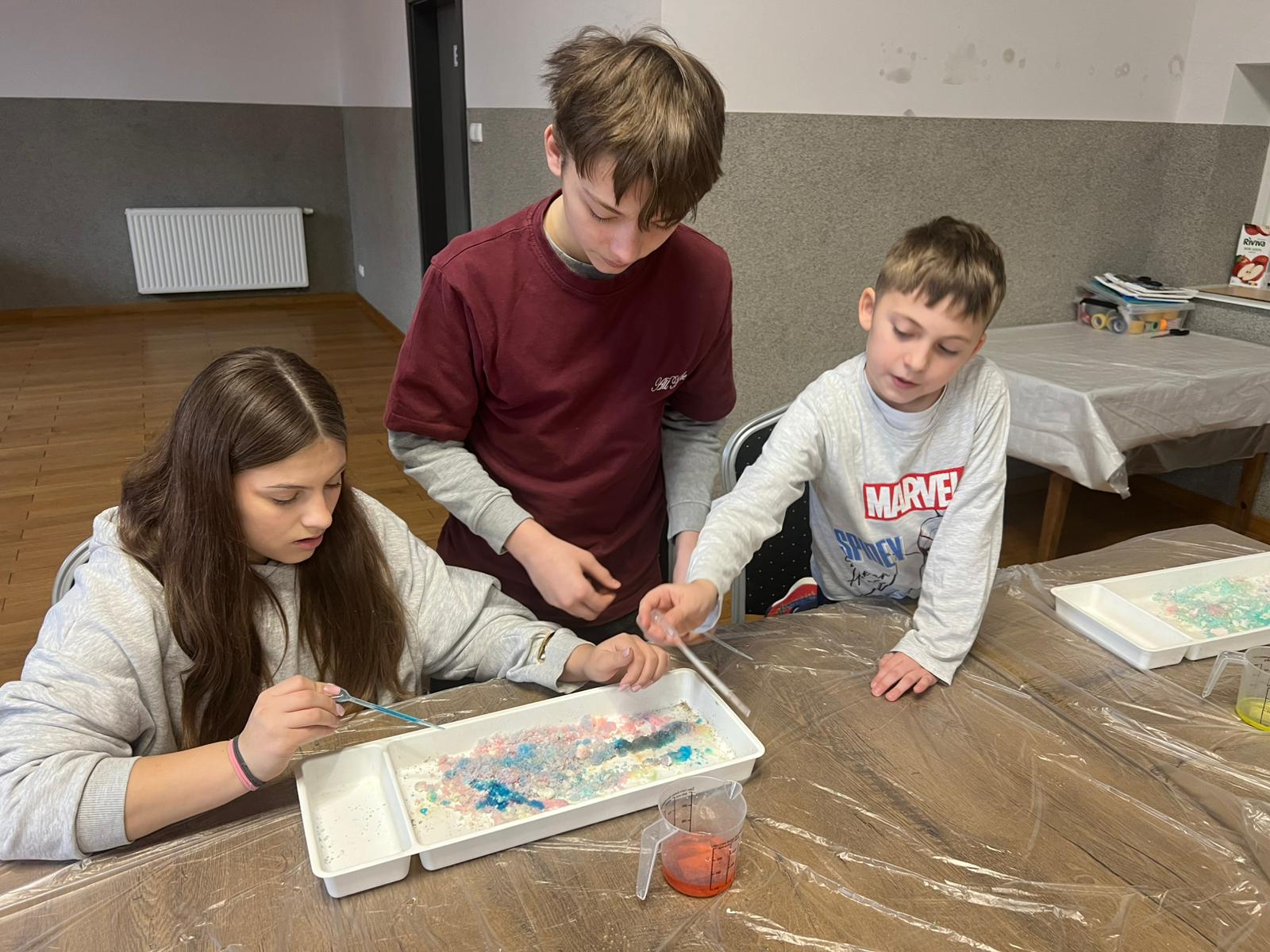 Nie zabrakło także emocjonującej zabawy w archeologów – dzieci prowadziły wykopaliska i odkrywały ukryte „skarby”, co wywoływało wiele radości i ekscytacji. Kolejne zajęcia dostarczyły uczestnikom sensorycznych i naukowych doświadczeń. Były eksperymenty z kolorowym hydrożelem, tworzenie slime, budowanie magnetycznych labiryntów z klocków LEGO i opiłków żelaza oraz poznawanie właściwości magnesów poprzez zabawę. Nauka przez działanie okazała się prawdziwym strzałem w dziesiątkę.