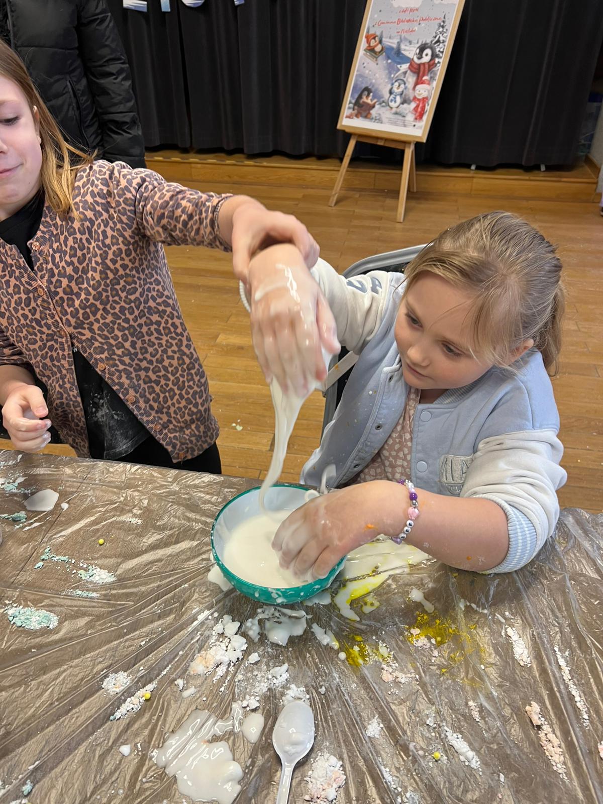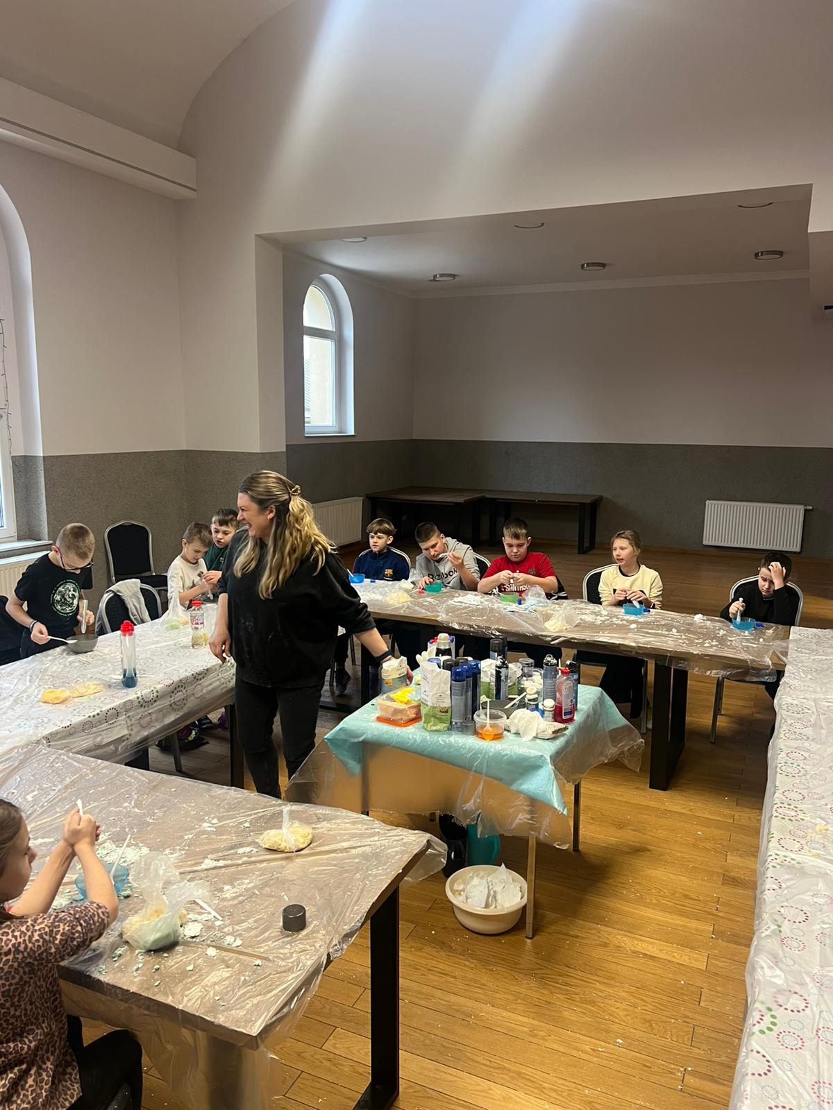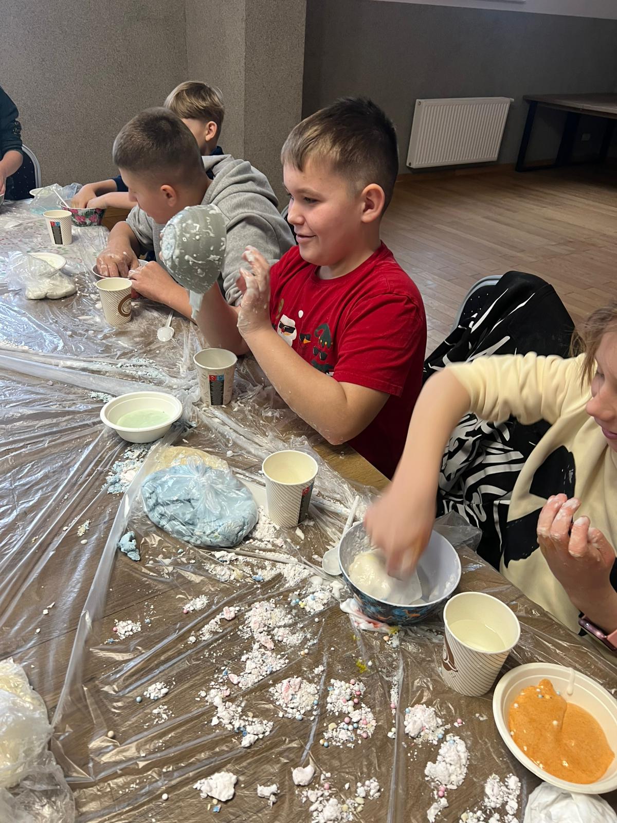 Kolejne spotkania przeniosły uczestników w świat eksperymentów i dziecięcej ciekawości. Dzieci samodzielnie tworzyły piankolinę, domowy piasek kinetyczny, ciecz nienewtonowską oraz uwielbiany slime. Było kolorowo, twórczo i bardzo wesoło. Podczas warsztatów z panią Eweliną Płócienniczak zwykłe trampki zamieniły się w małe dzieła sztuki – powstały unikatowe, barwne projekty, z których każdy uczestnik mógł być dumny.