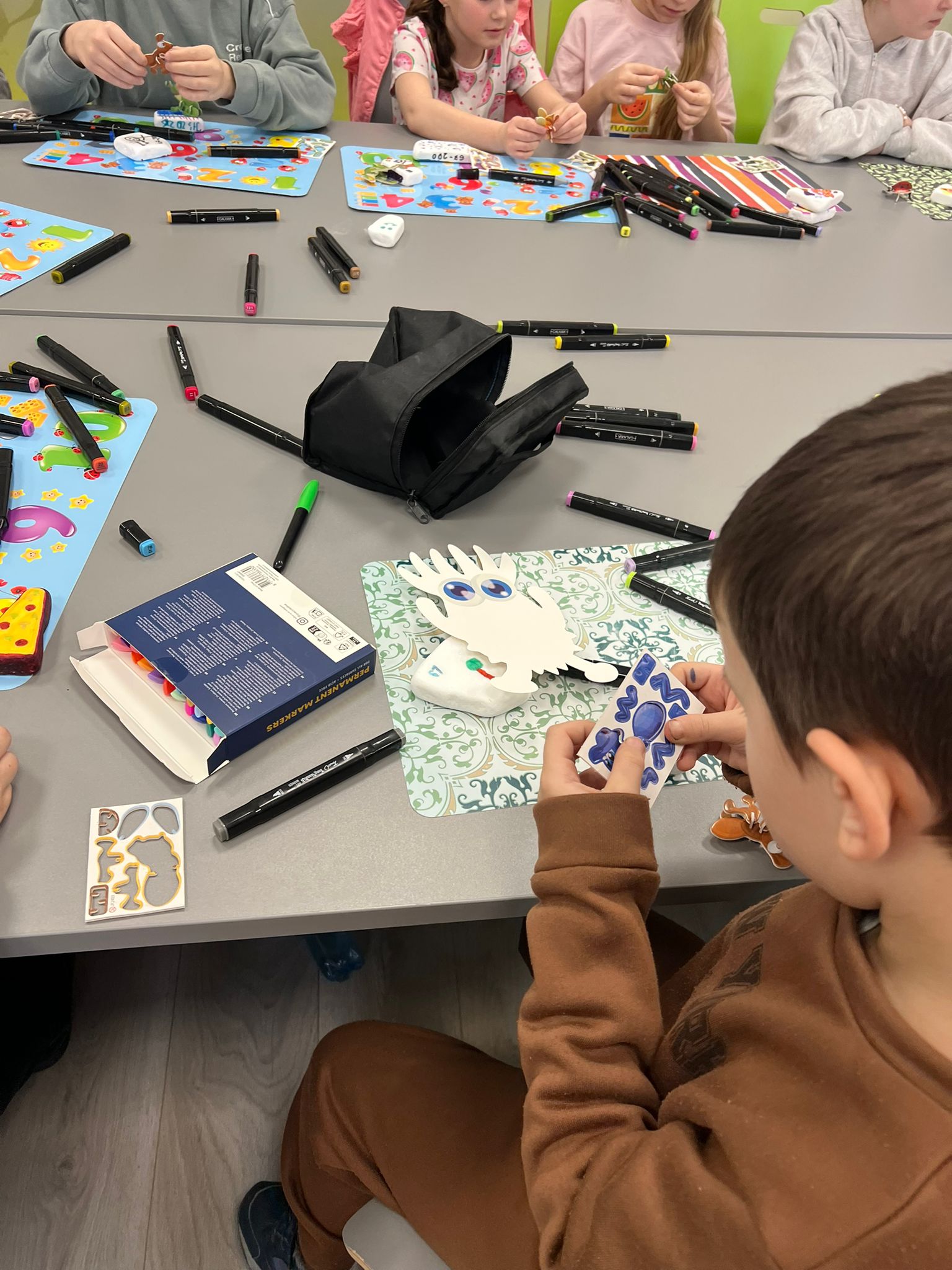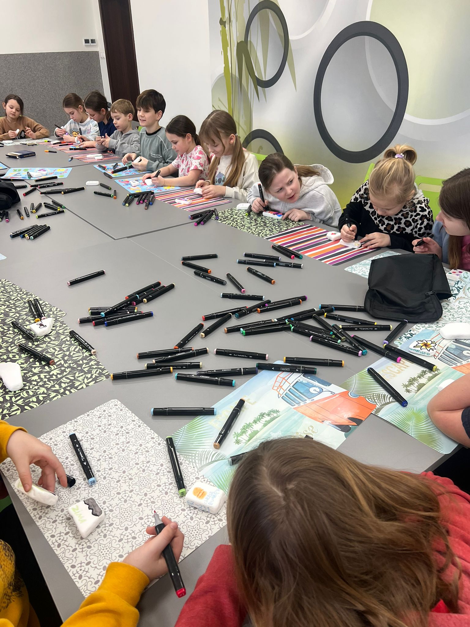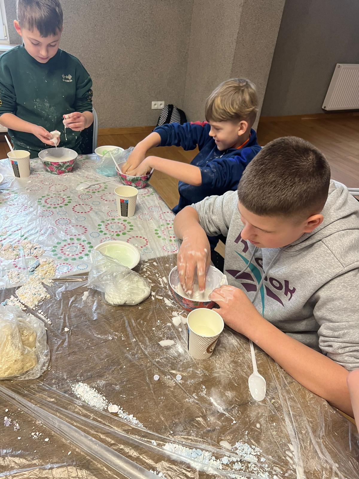 Kolejne spotkania przeniosły uczestników w świat eksperymentów i dziecięcej ciekawości. Dzieci samodzielnie tworzyły piankolinę, domowy piasek kinetyczny, ciecz nienewtonowską oraz uwielbiany slime. Było kolorowo, twórczo i bardzo wesoło. Podczas warsztatów z panią Eweliną Płócienniczak zwykłe trampki zamieniły się w małe dzieła sztuki – powstały unikatowe, barwne projekty, z których każdy uczestnik mógł być dumny.