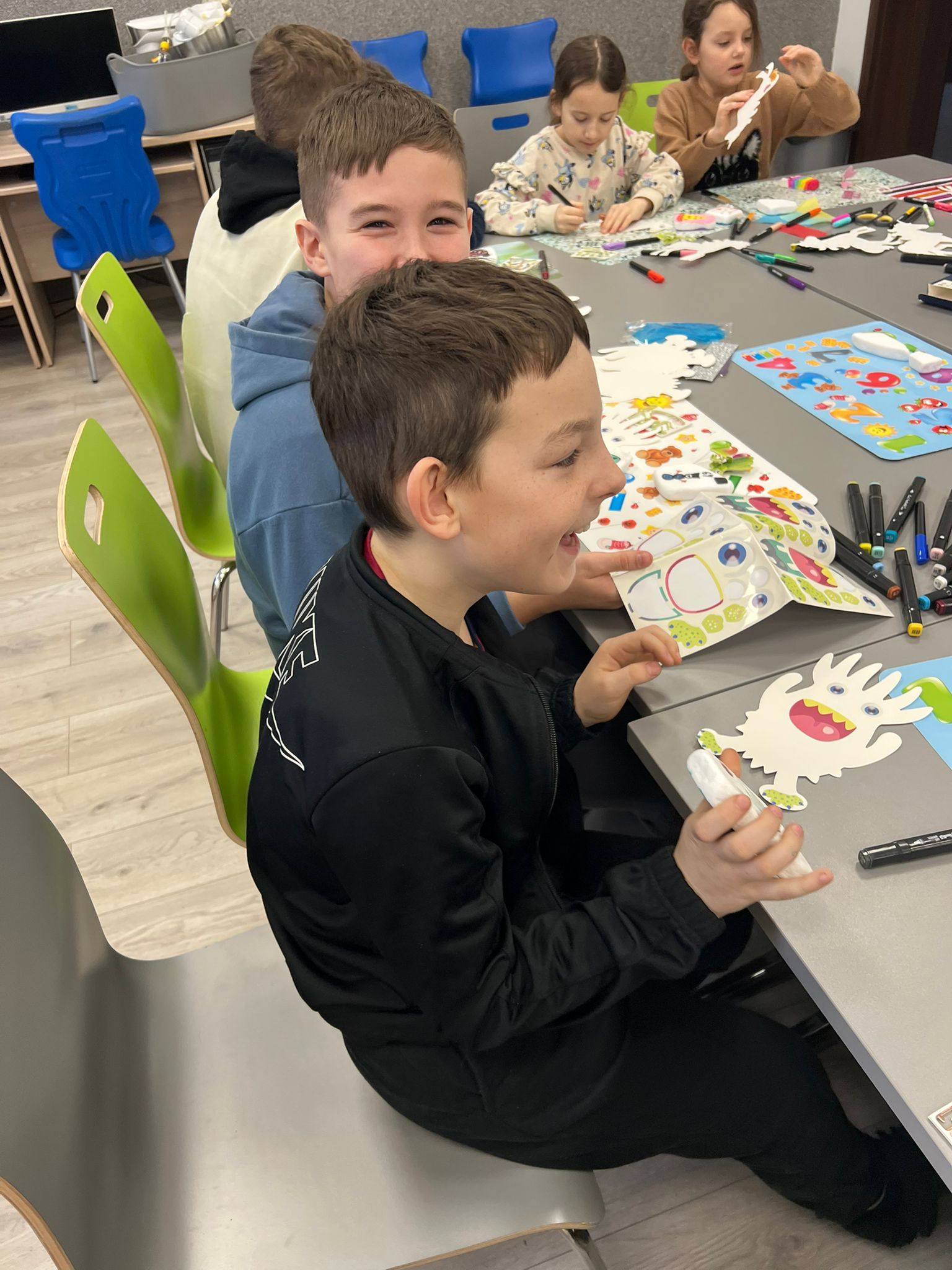 Nie zabrakło również wspólnego budowania – razem powstała mała osada jak z Bullerbyn. Tylko trzy domy, ale za to ile współpracy, śmiechu i integracji podczas tworzenia. Na zakończenie ferii odbył się słodki dzień pełen radości: były gofry, cake popsy oraz kreatywne, kolorowe kwiaty z pianek i żelków.