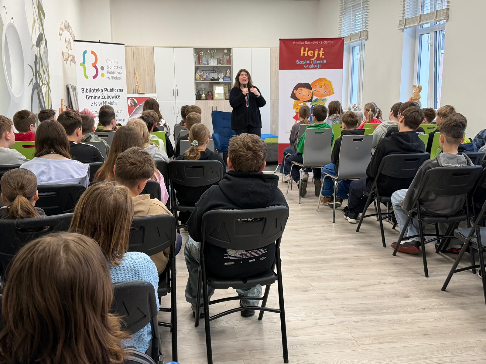 W drugiej części spotkania młodzi czytelnicy mieli okazję poznać bohaterów książki Hejt. Basia i Henio w akcji. Autorka w ciekawy i przystępny sposób opowiedziała o ich przygodach, pokazując, że nawet trudne tematy można przedstawić w sposób zrozumiały i angażujący.